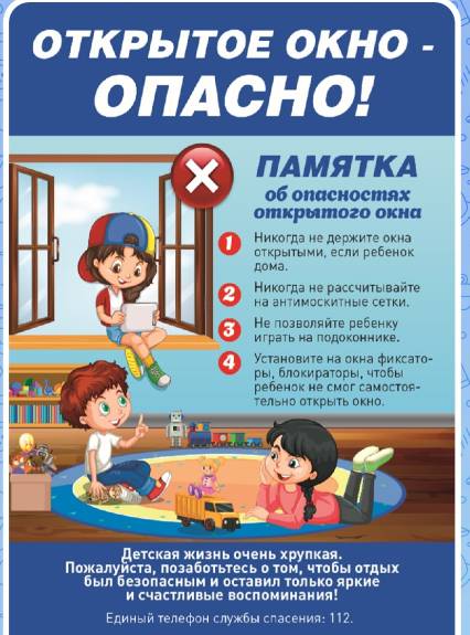 Ежегодно летом отмечается рост несчастных случаев, связанных с выпадением маленьких детей из окон. Опасность представляют легкий доступ детей к окнам, недостаточный контроль со стороны взрослых, а также москитные сетки, устанавливаемые на пластиковые окна.